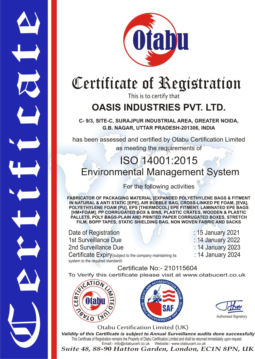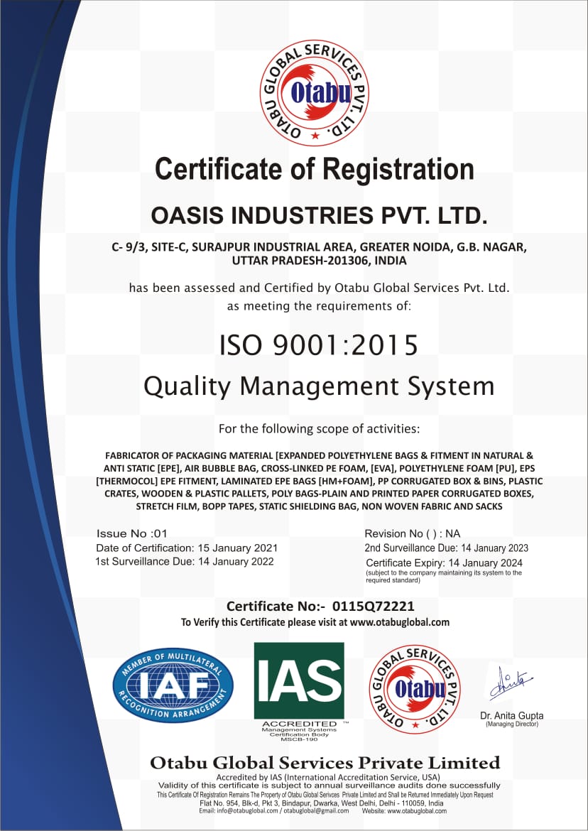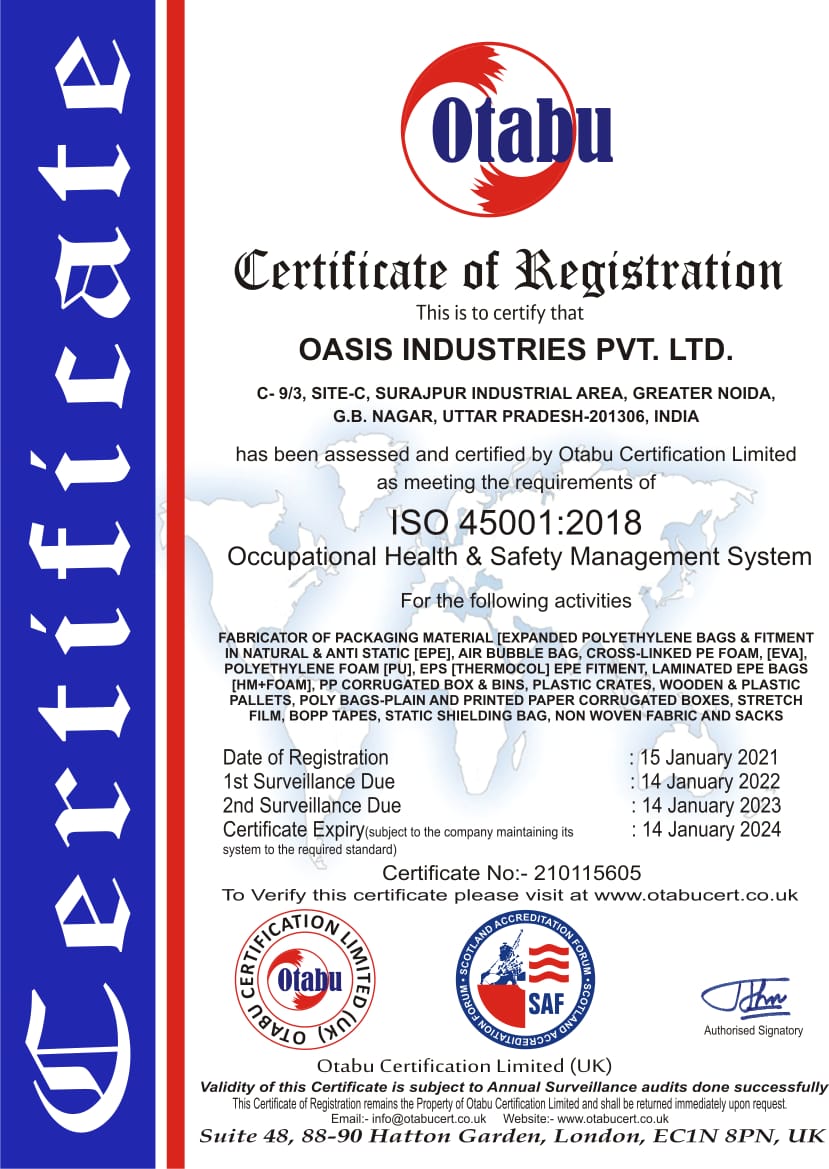 Oasis Industries Pvt Ltd is An ISO 9001:2015, OHSAS 18001:2007 certified company